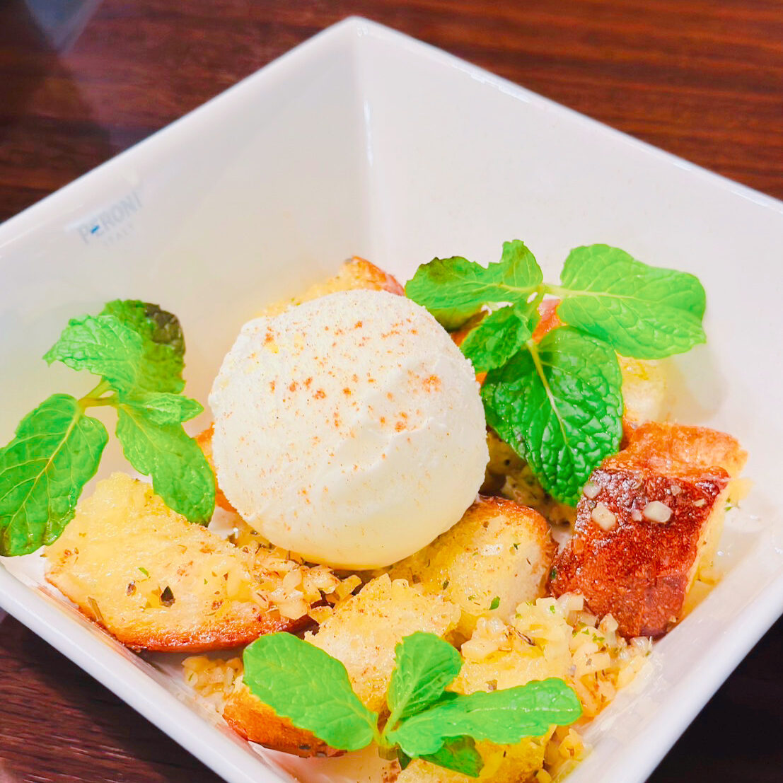 ガーリックバル唯一のスイーツ。香ばしいトーストににんにくの旨みと蜂蜜の甘みを重ね、バニラアイスを添えた甘じょっぱい一品。