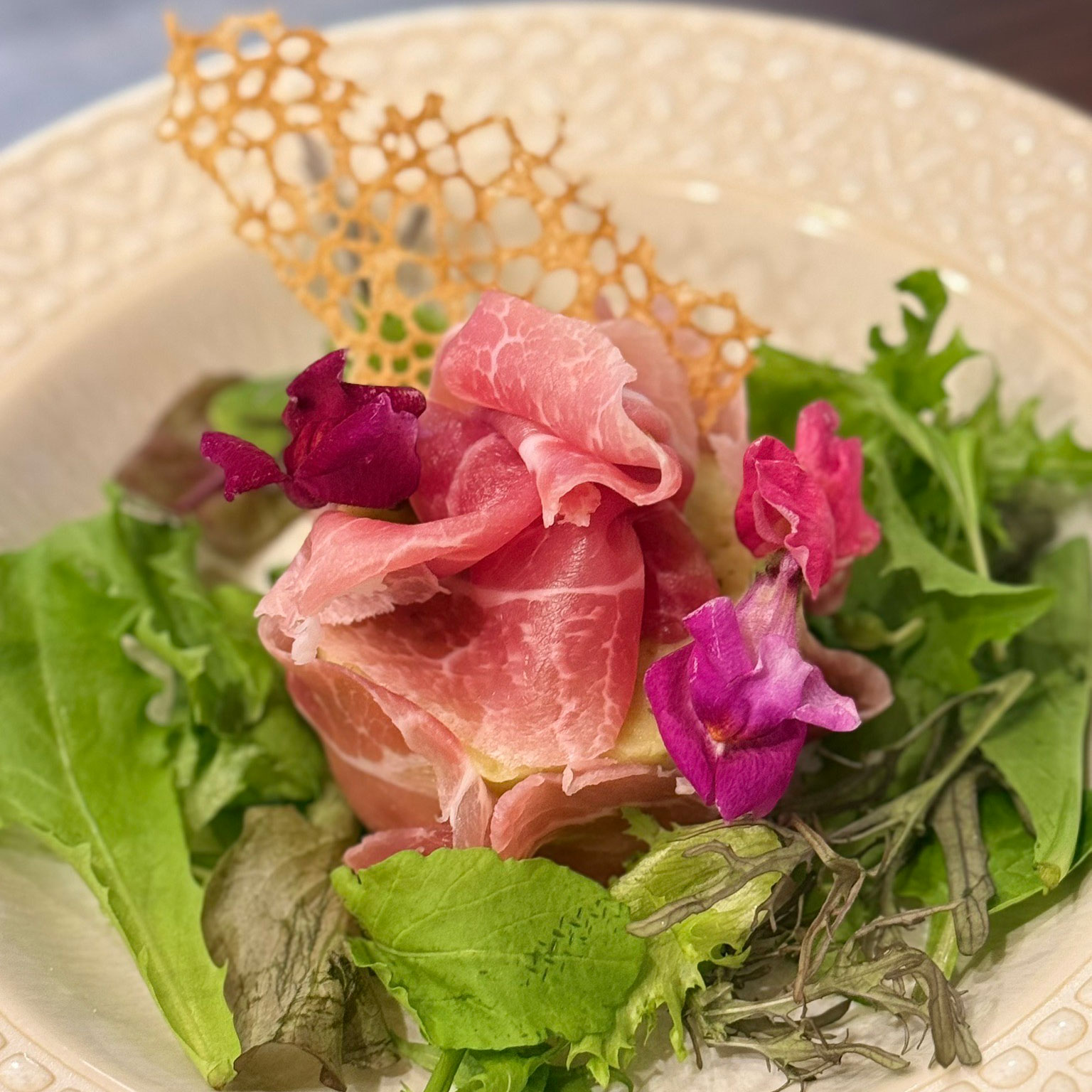 まろやかなポテサラを生ハムで包み、ジェノベーゼの香りを添えた一品。塩気とコクに爽やかな風味が重なります。