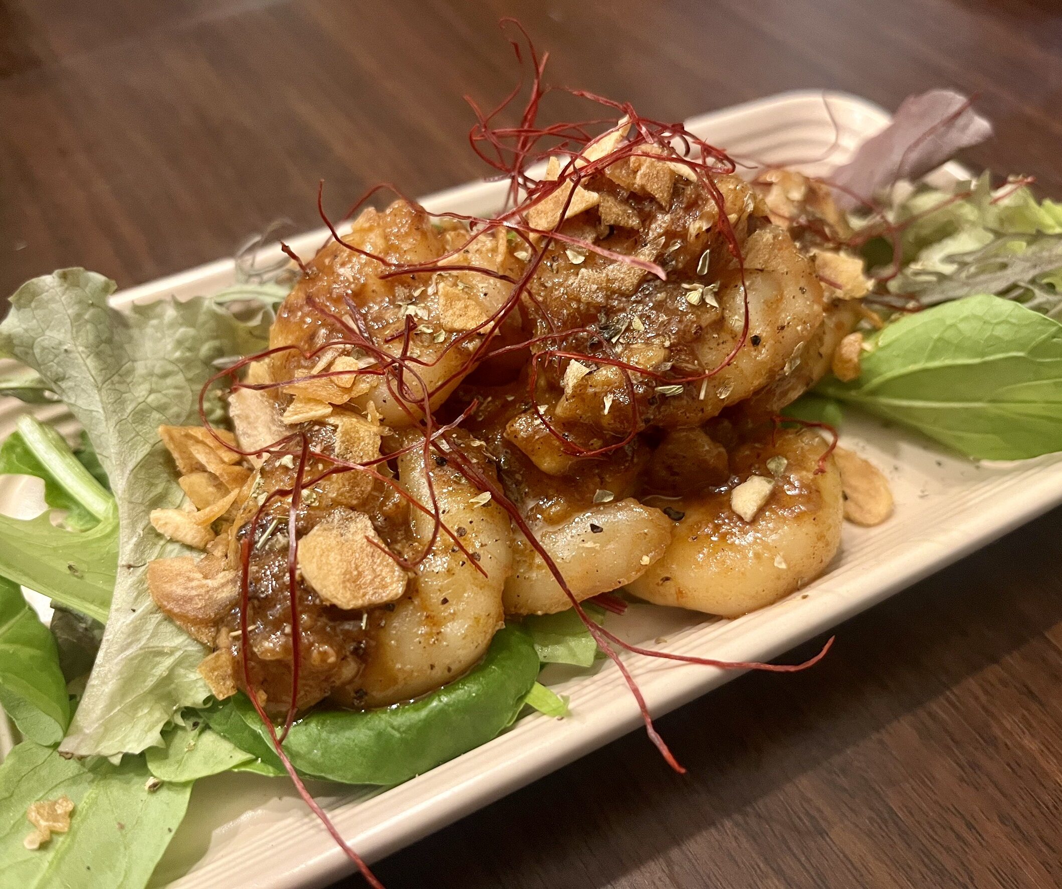 梅水晶のすっきりした酸味に、揚げにんにくの香ばしさがキレよく重なる一品。軽いのに印象に残る、味のコントラストが魅力。