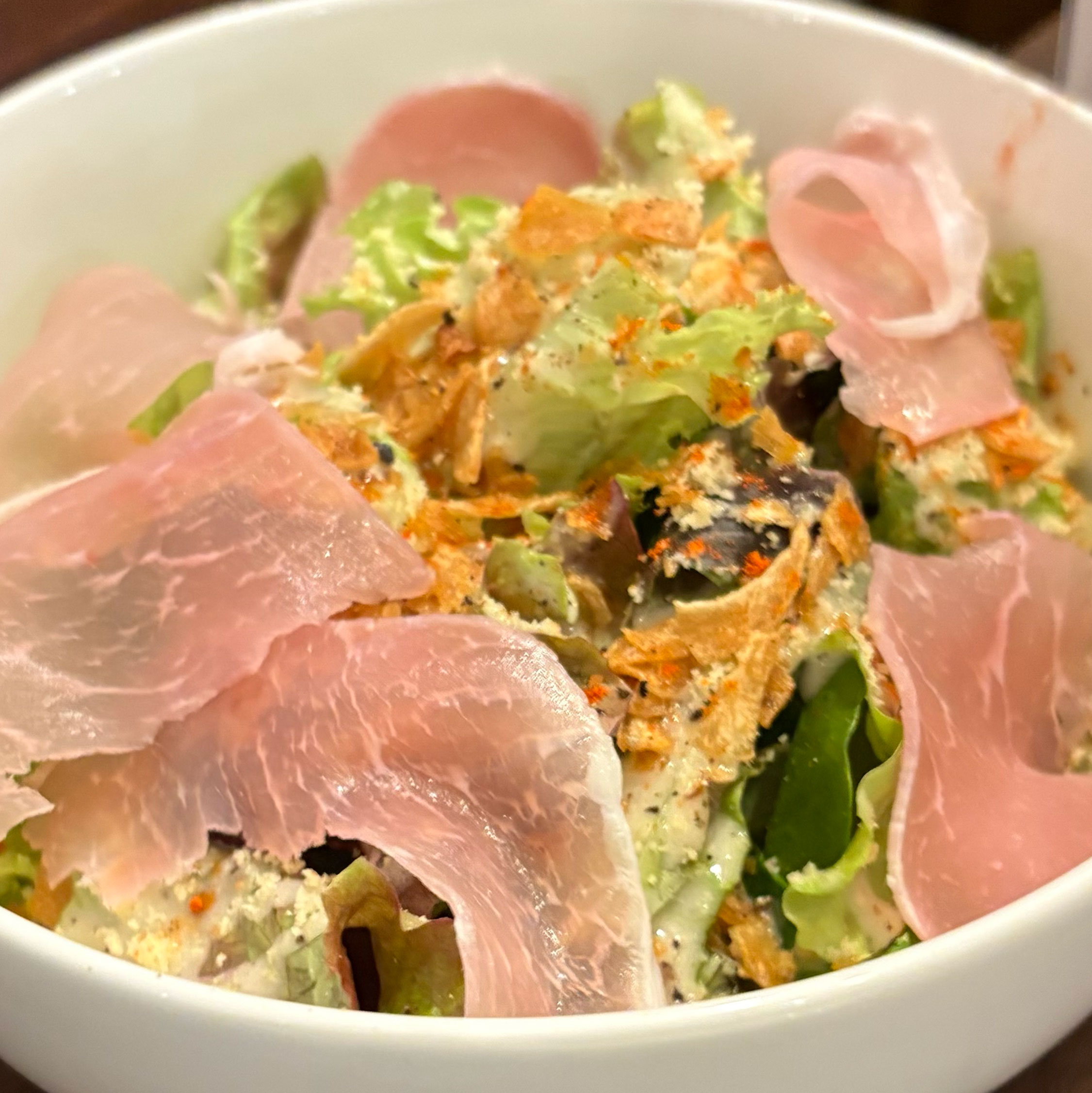 生ハムの旨みとシーザードレッシングのコクがよく合う定番サラダ。シャキッとした野菜で軽く仕上げました。
