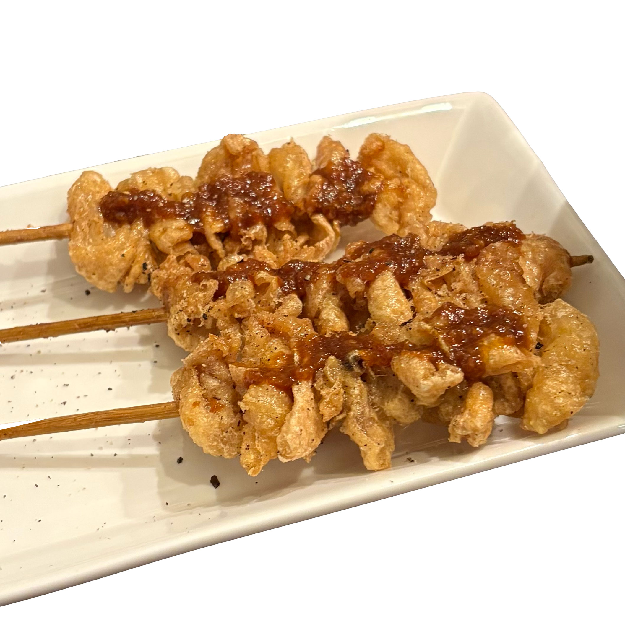 Chicken skin skewers finished crisp by grill frying. Light texture with concentrated savory flavor.