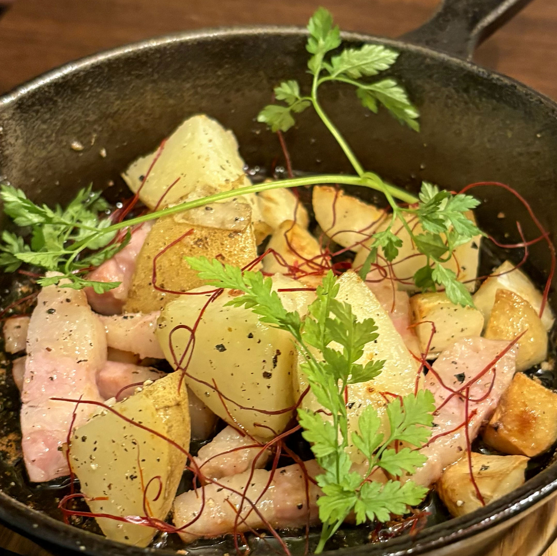 ベーコンの旨みと香ばしさをポテトにじんわり移した一皿。にんにくの風味が全体をまとめ、温かさとコクが沁みる味わいに仕上げている。