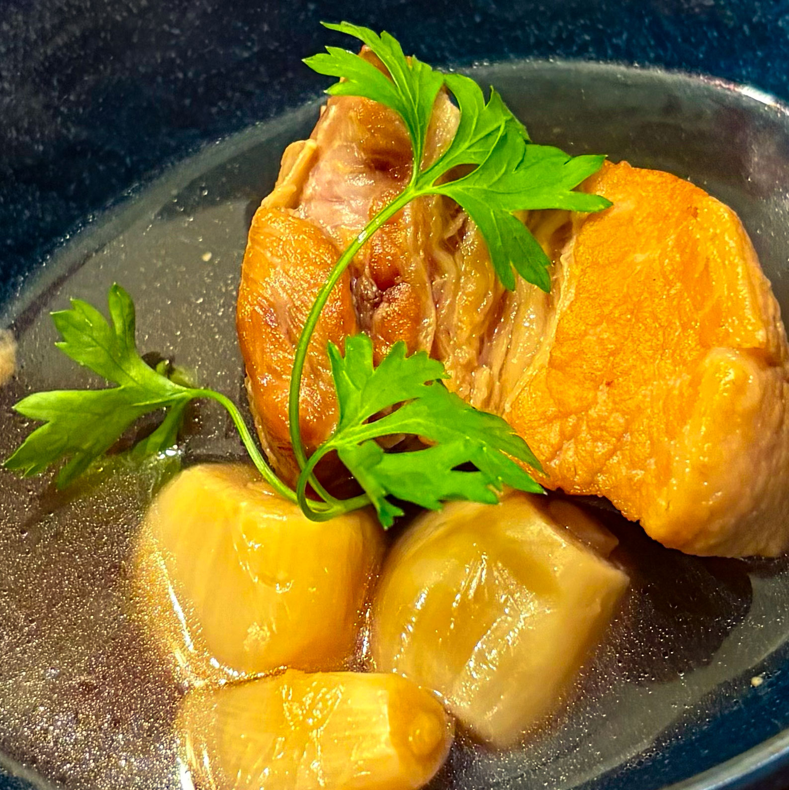とろりとほどける豚の角煮に、じっくり煮込んだにんにくの香りを重ねた一皿。脂のコクと旨みが溶け合い、深い余韻を残す。