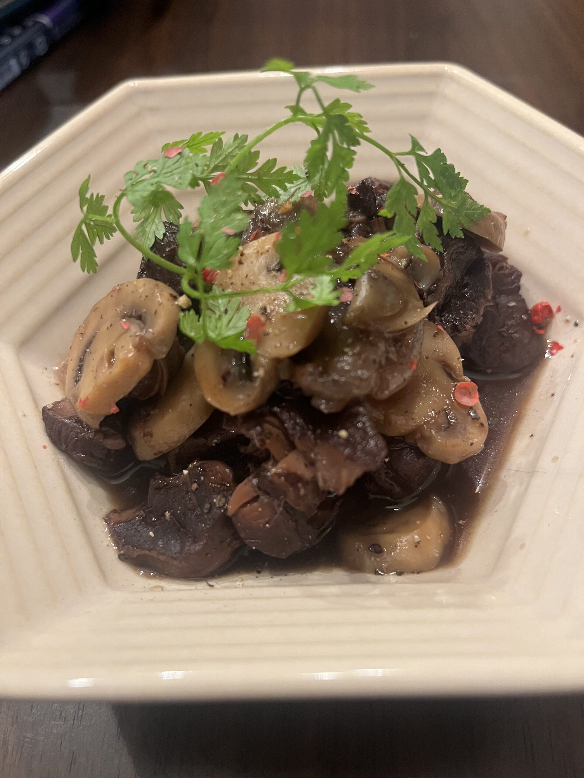 A Unique Soy Sauce Ajillo - Served with Two Slices of Baguette.